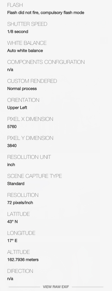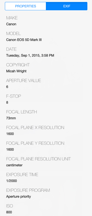 Once we had the image properties sorted we thought it would be beneficial to include a little more detail about the photo. What's a better way than getting this information from the EXIF data? There isn't one, so that's what we did! Not every photo on the web has its EXIF data intact, but the ones that do offer some really cool detail. Who took the photo and when? What camera took the photo? What were the camera settings as far as aperture, iso, exposure, etc.? Where was the photo taken?? All of this information is stored in your photos, you just can't see any of it! Click the two images below to see all the EXIF data we expose.