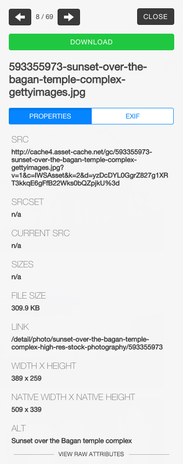 The initial screen you're presented with outlines the properties of the image. It gives you an overview of the src, srcset, current src, sizes, file size, width, height, natural width, natural height, any alt text, and a link if one is present. This great for quickly identifying some properties of the image itself as well as helps determine if an image is using the latest responsive technique, namely srcset and sizes. You can also expand the raw attributes box at the bottom of the sidebar to see the exact attributes applied to the image including any data attributes. Click the image to the left to see an example in action. Being able to quickly view this information for multiple images on a page with a couple clicks is already a winning proposition.